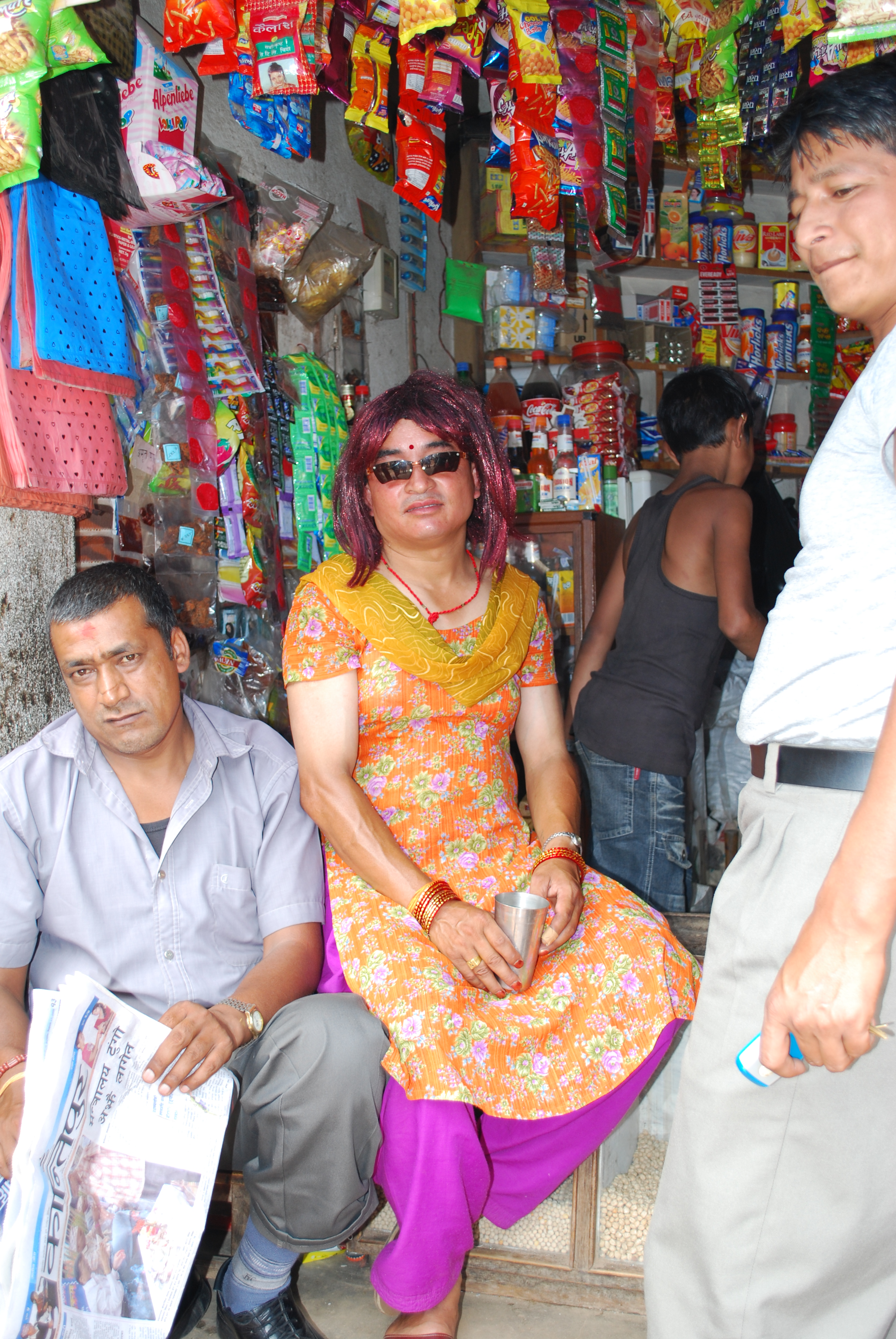 The carnival character also includes men dressed in women's clothes, "gay jātra".