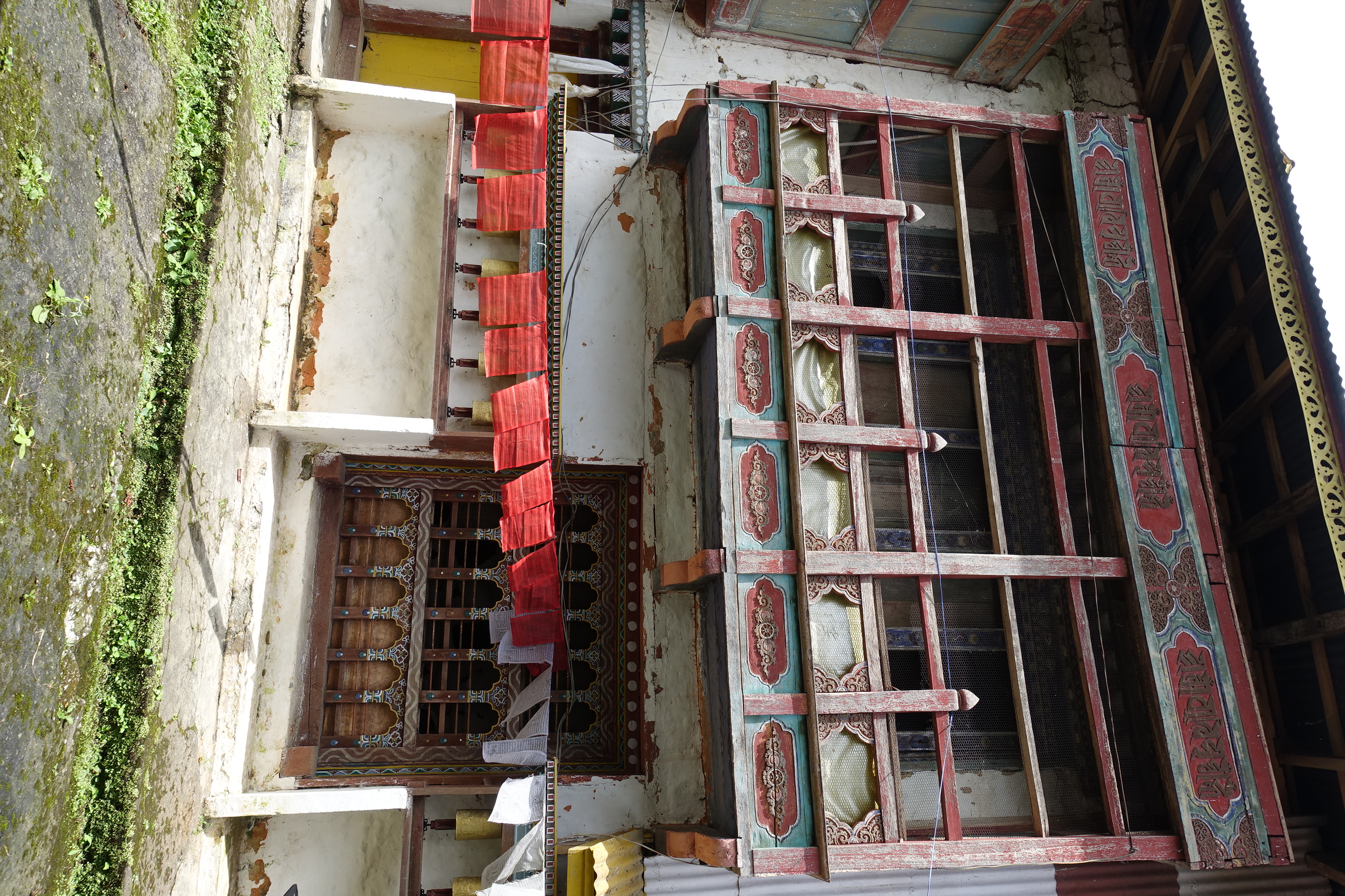 Eastern exterior wall of the temple with entrance door, wooden balconies, windows and prayer wheels