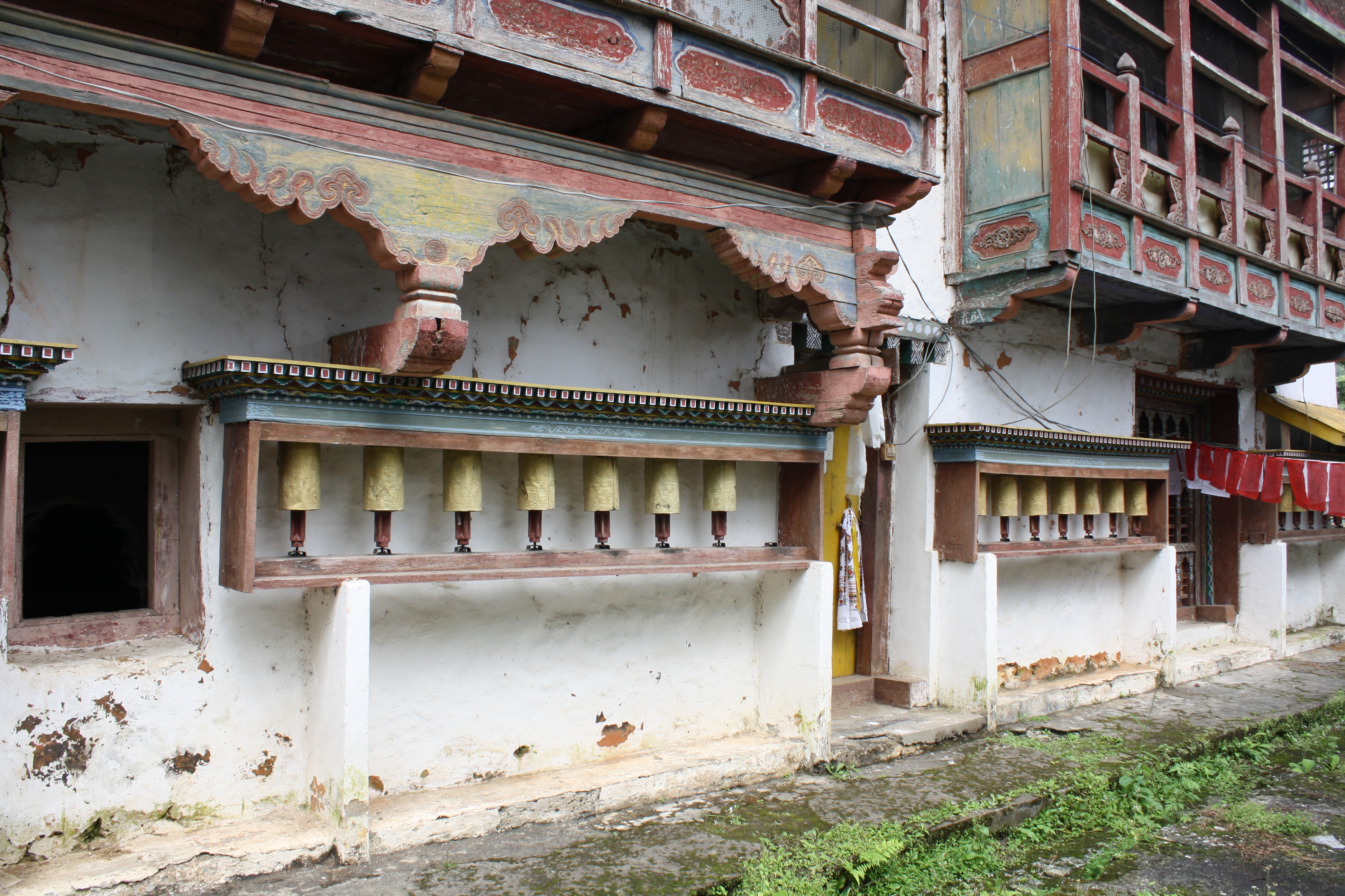 built environment:temple visual and verbal communication:prayer flags architectural element:entrance built environment:monastery processes and techniques:woodcarving affiliation:Tibetan Buddhism architectural element:door&window element architectural element:balcony architectural element:capital affiliation:stod 'brug affiliation:'brug pa bka' brgyud group:Bhutanese visual and verbal communication:prayer wheel