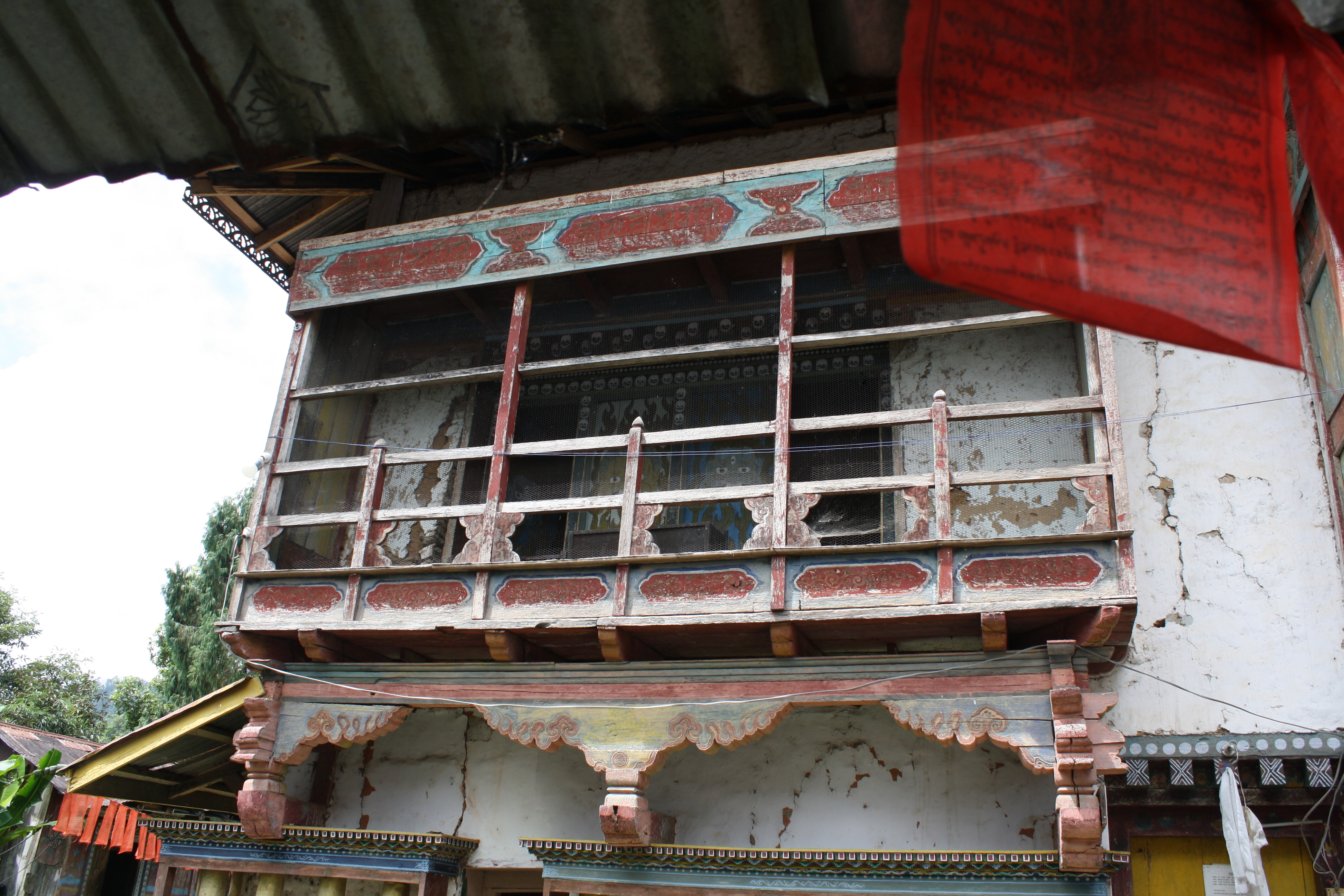 Wooden balcony on the eastern exterior wall of the temple with paintings of skulls and protective deities