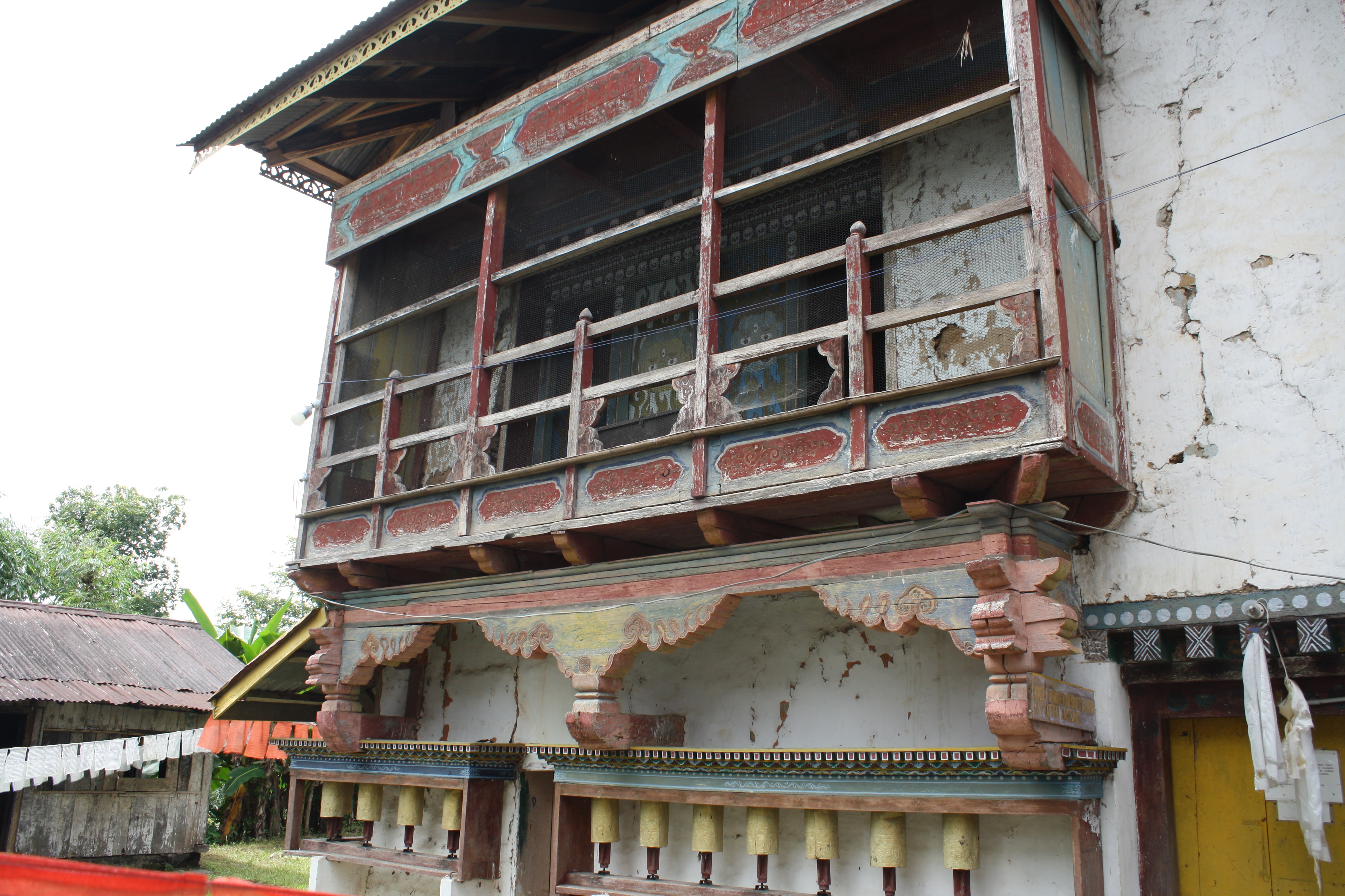 Wooden balcony on the eastern exterior wall of the temple with paintings of skulls and protective deities