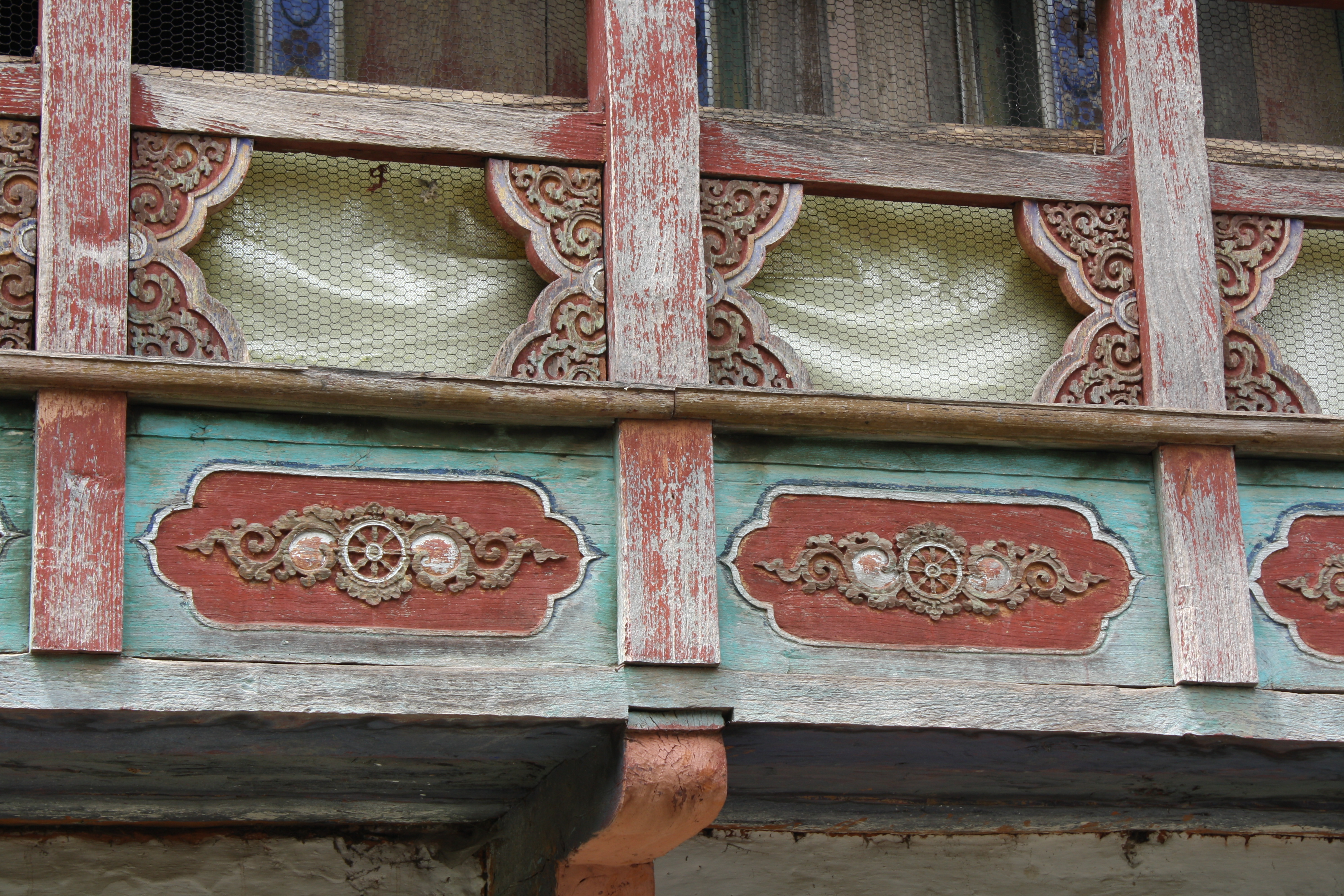 Wooden balcony on the eastern exterior wall of the temple with woodcarved ornaments