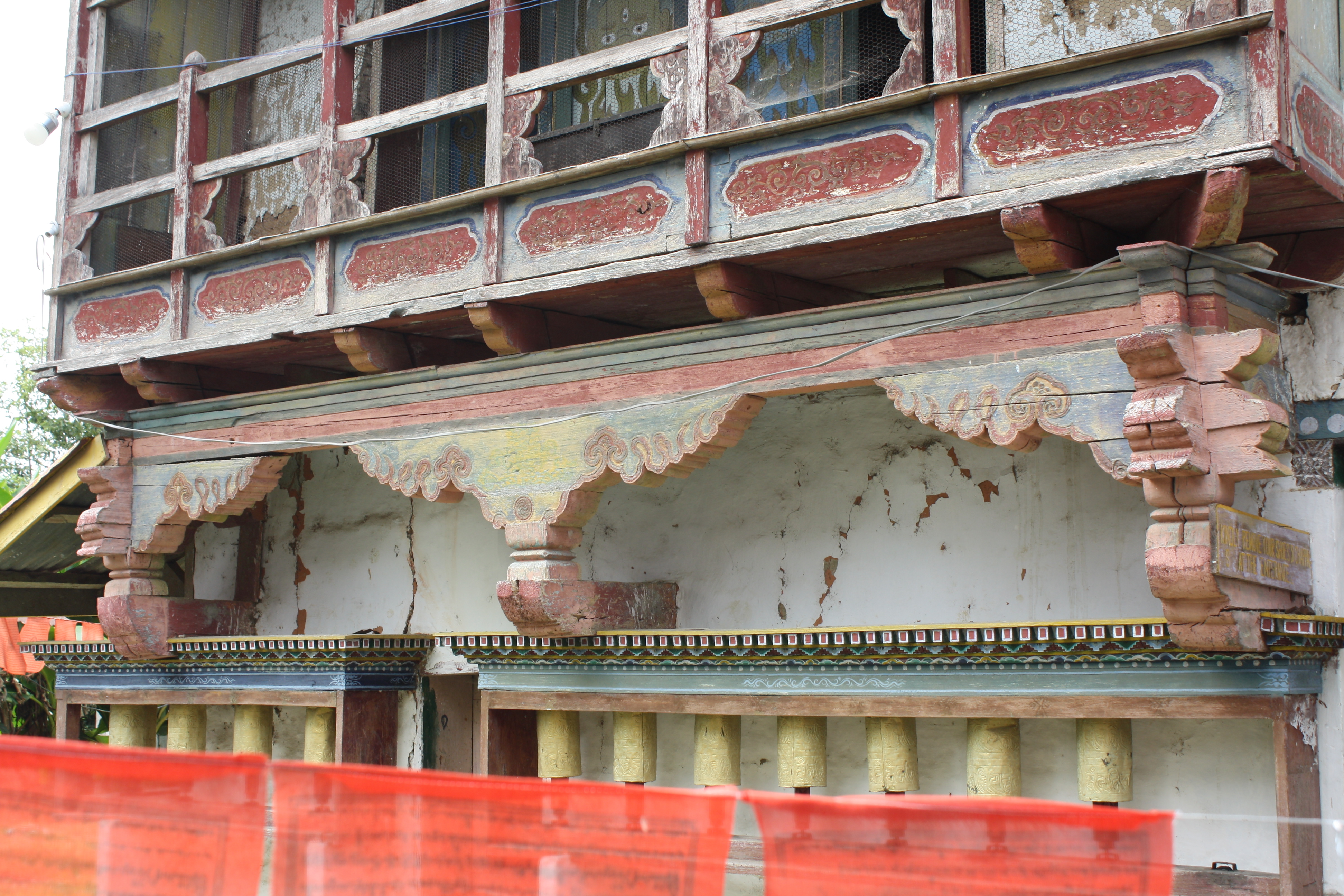 Eastern exterior wall of the temple with wooden balcony, window and prayer wheels