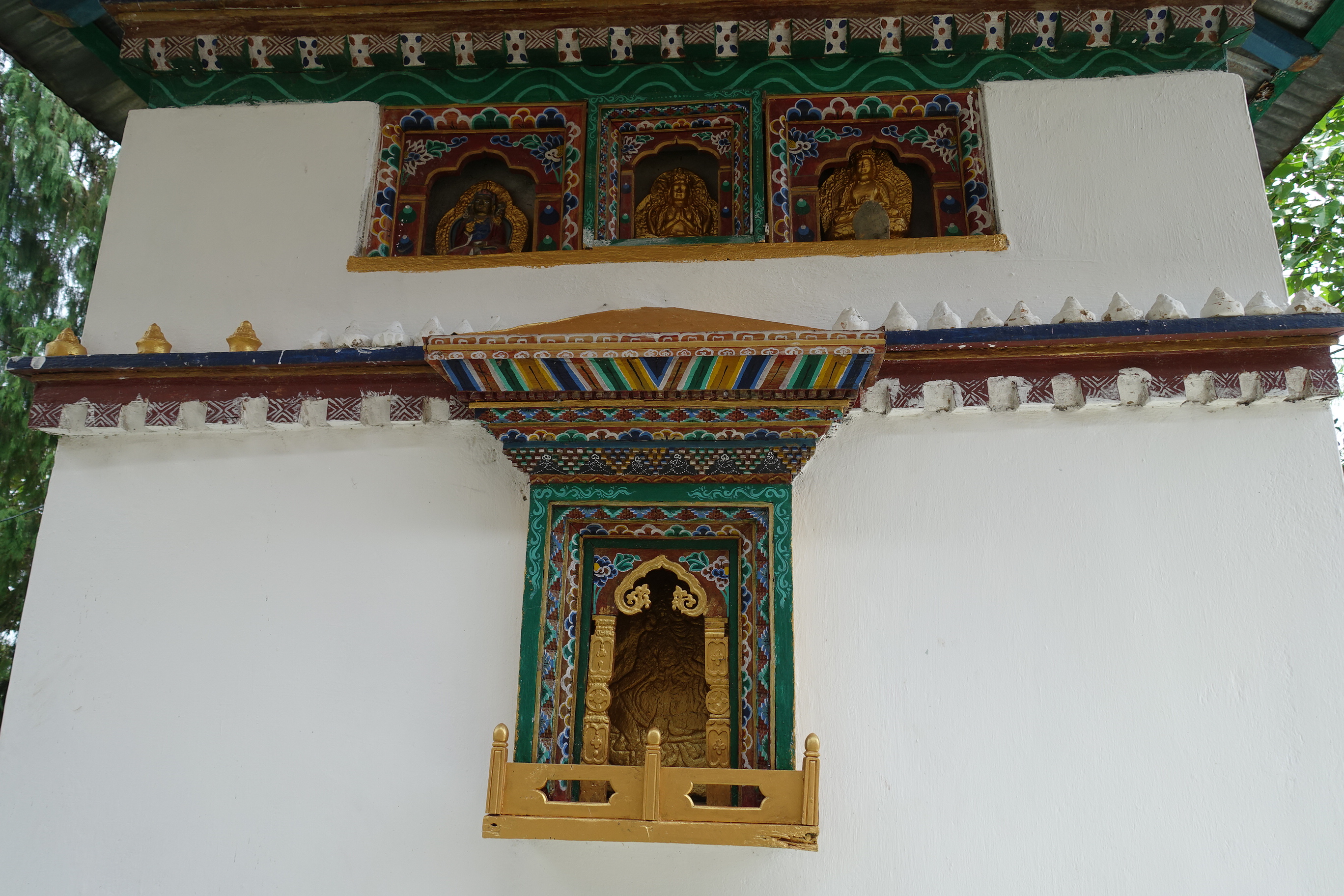 - Bhutanese style (Tib. khang bzang) chorten at eastern temple courtyard; West wall with small niches, containing stone reliefs of Tārā (below), and Padmasambhava, Zhabdrung Rinpoche, Amitāyus (above)