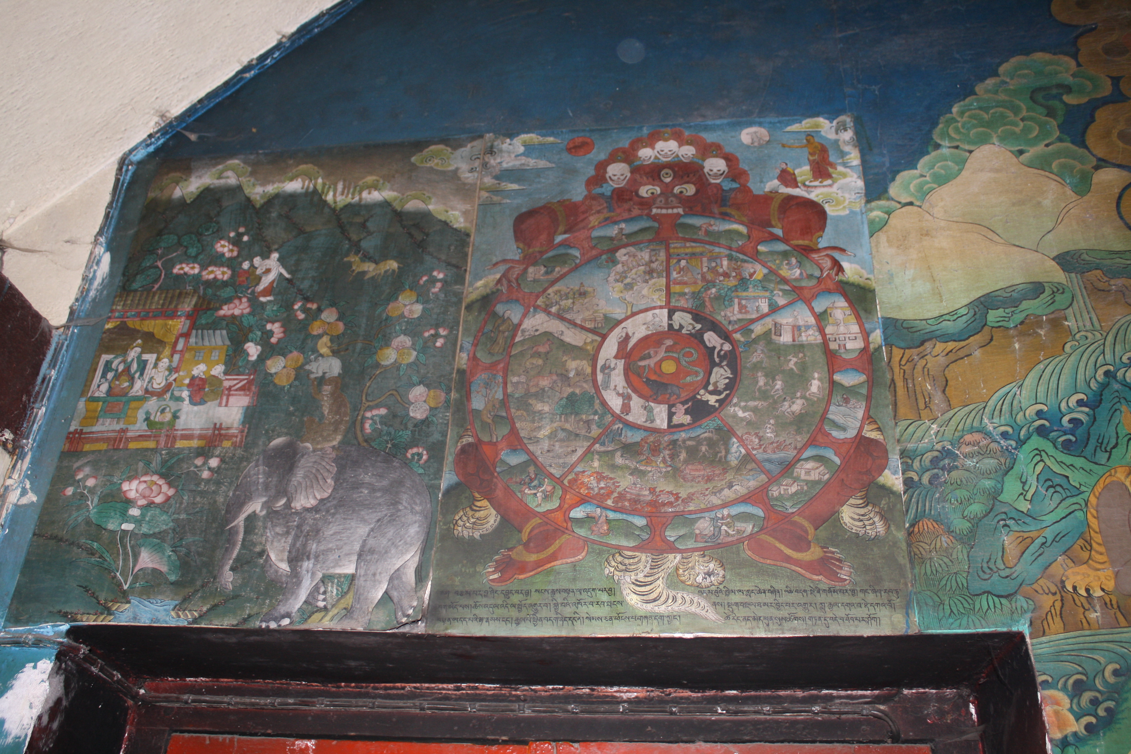 visual and verbal communication:mural paintings affiliation:Tibetan Buddhism iconography:Bhavacakra built environment:temple affiliation:dge lugs pa architectural element:entrance built environment:monastery