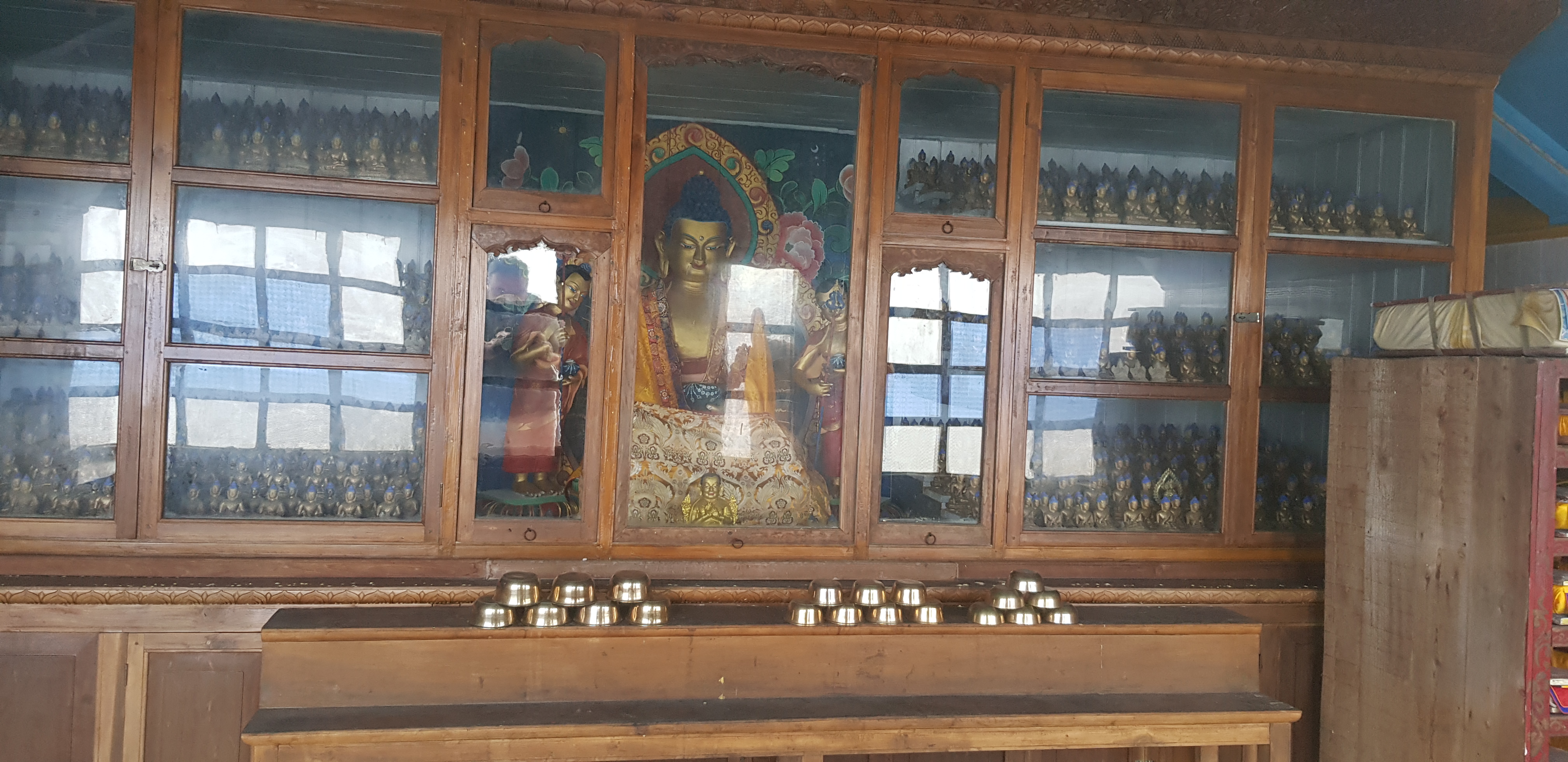 built environment:temple built environment:chapel built environment:monastery affiliation:Tibetan Buddhism iconography:Śākyamuni affiliation:dge lugs pa furnishings and equipment:bookshelves visual and verbal communication:bronzes iconography:One Thousand Buddhas architectural element:roof