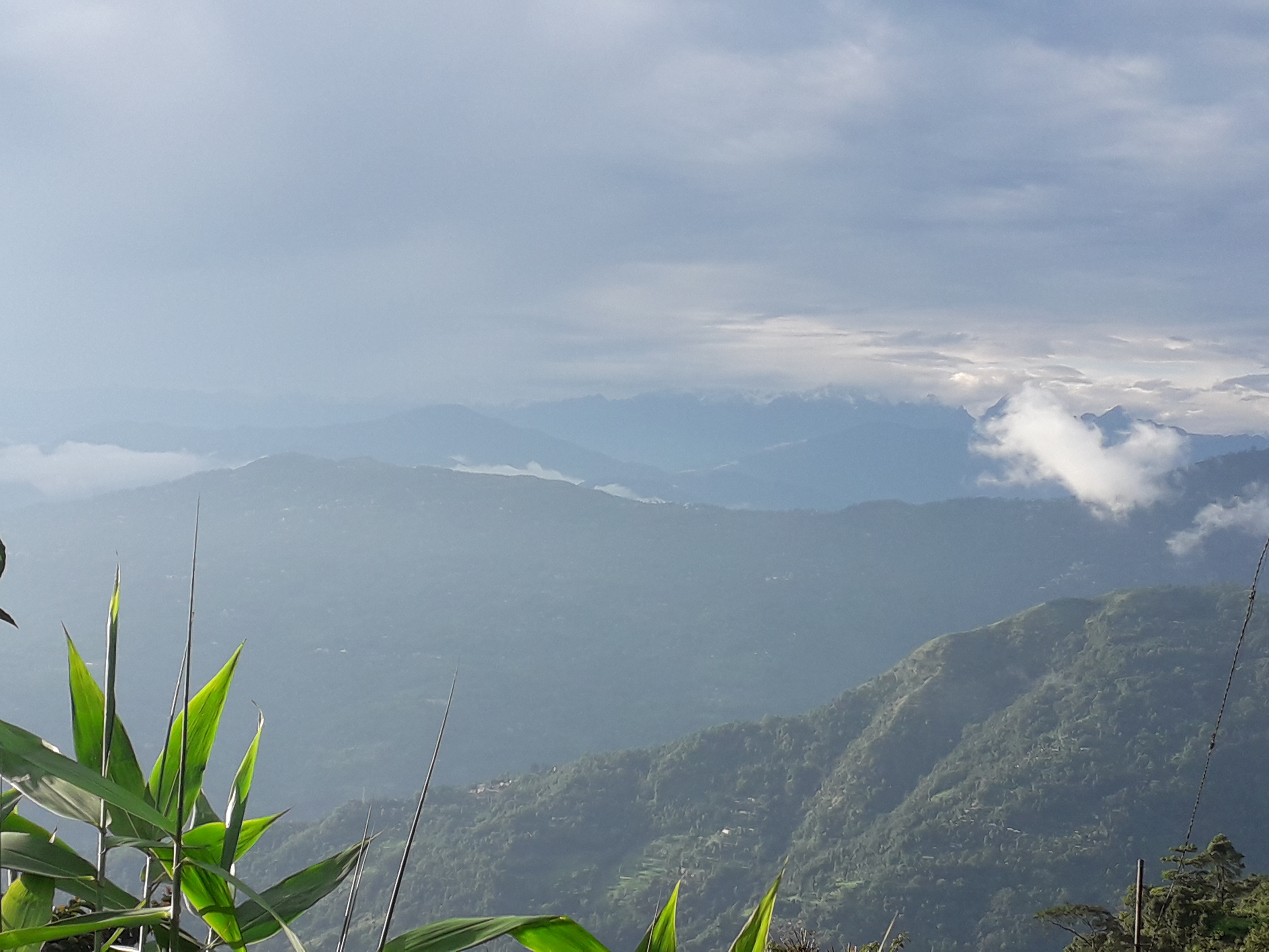 Road from Lolegaon to Kaphar; View to the northwest to city of Kalimpong, Kangchendzonga mountain range, and Kaphar
