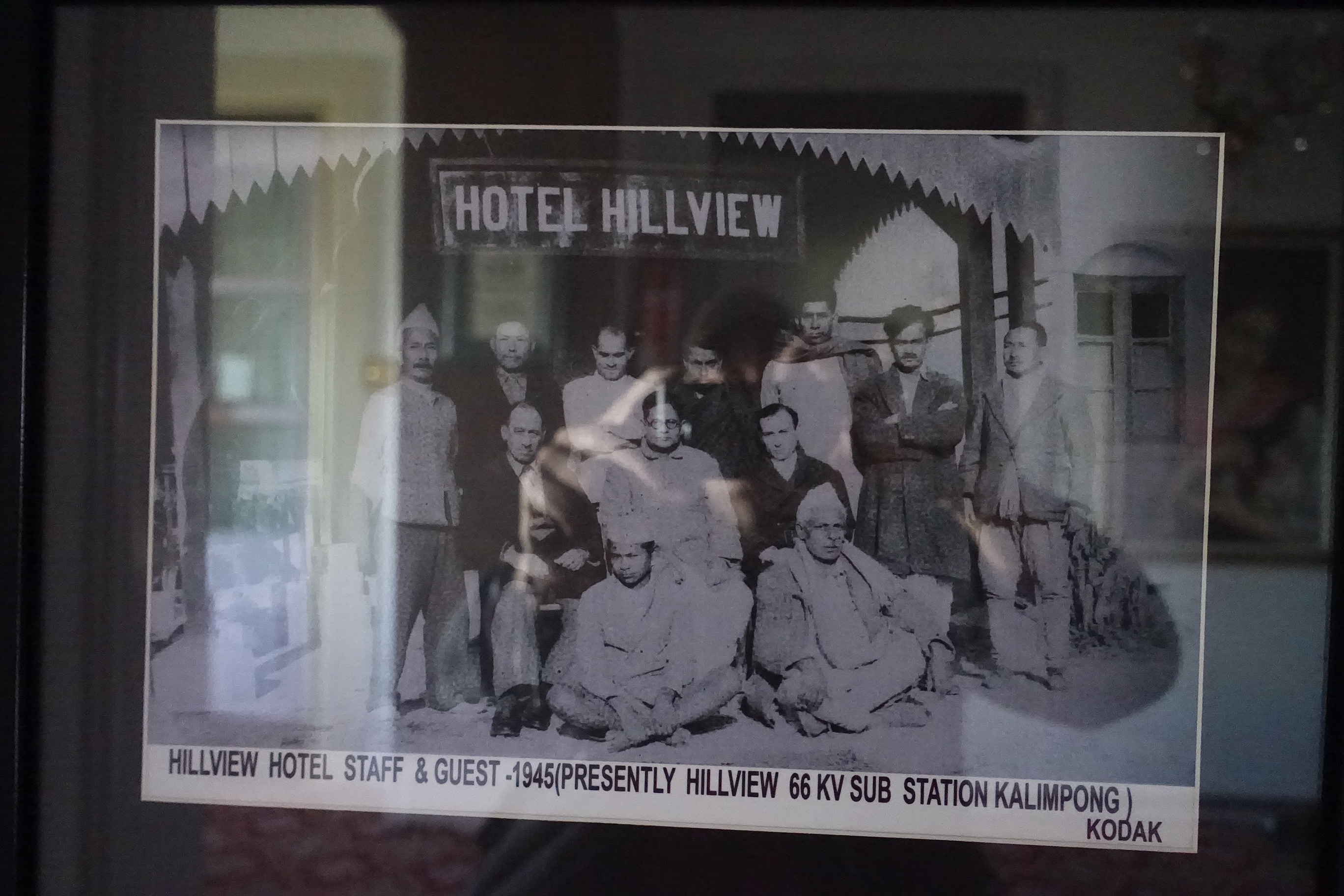 Photography in the entrance area of the main building; "Hillview Hotel staff & guest; 1945; (presently Hillview 66 KV Sub Station Kalimpong"