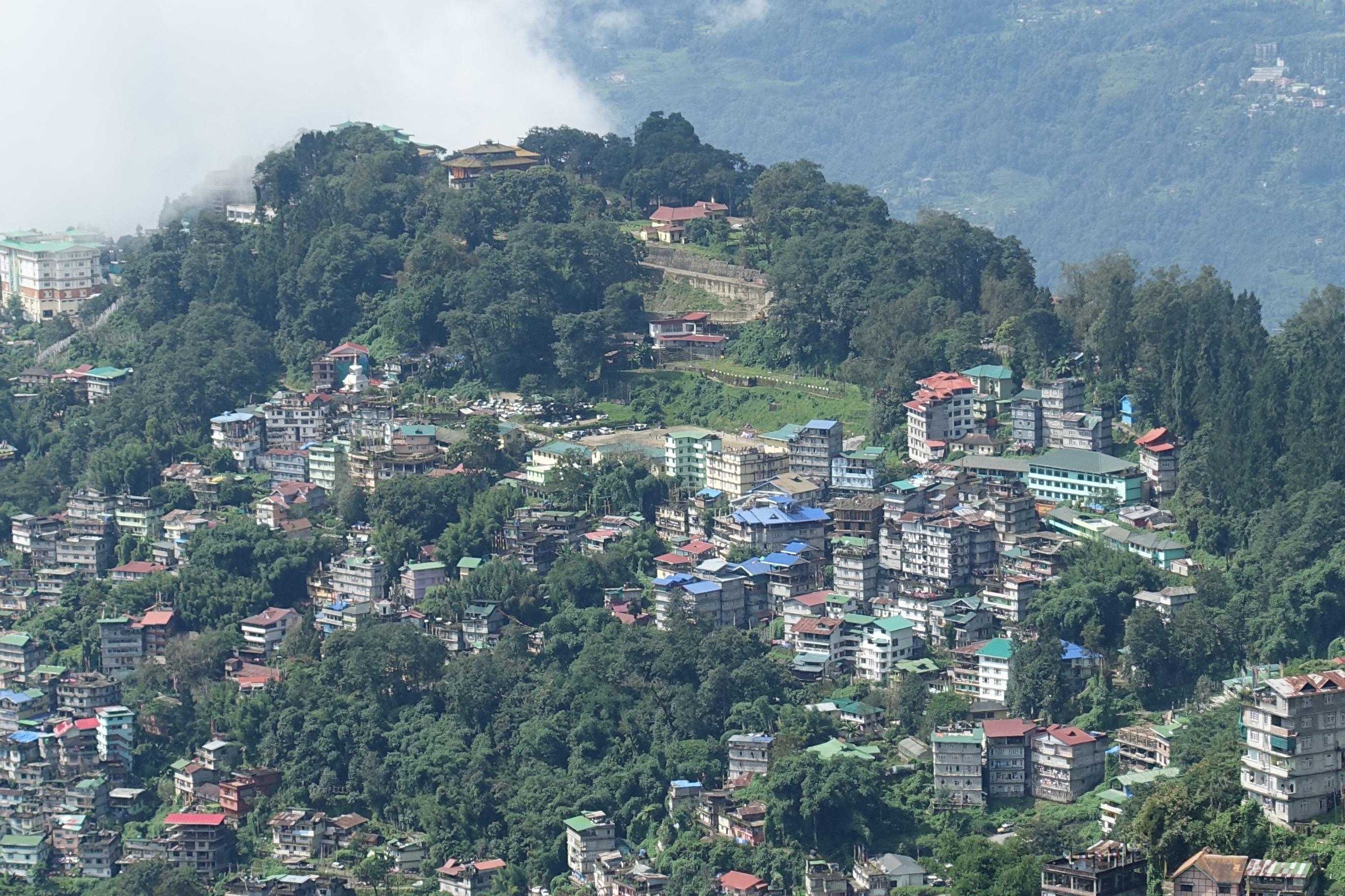 View on Gangtok from a roof of a house at Jawaharlal Nehru Road; Tsuglagkhang Monastery and Palace